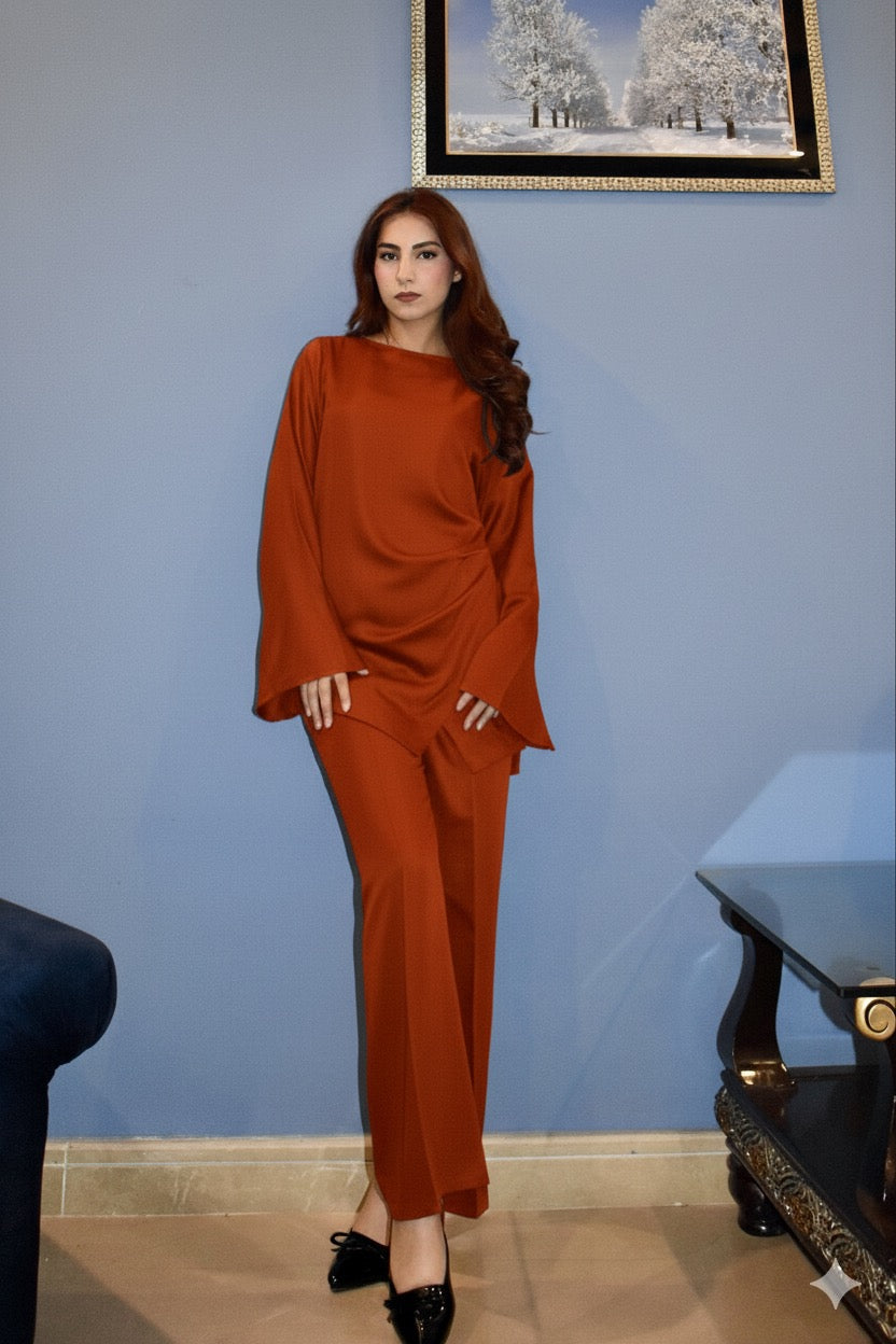 Effortlessly chic, this two-piece set features a flowy long top with relaxed bell sleeves and straight-cut trousers for a sleek, minimalist silhouette. Crafted for comfort and elegance, it’s the perfect everyday luxe look easy to style, flattering to wear, and timeless for any occasion.